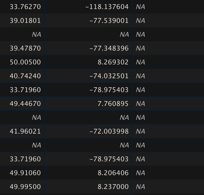What I realized shortly thereafter was that some of these variables were irrelevant. You can see in the example above there is one entire columns of NA which is an empty column I did delete from the original file. The survey tool had also automatically added things like the lat/long coordinates of the user who completed the survey. If I kept these columns with NA in there, then I could not run an na.omit script on my code to do listwise deletion.